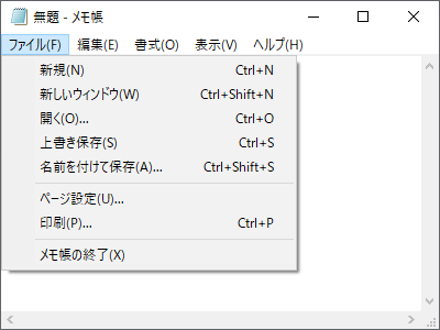 ※アプリによっては、ショートカットキーが異なる場合があるため、メニューを選択するとき等に表示されるショートカットキーを確認しておくと安心です。例えば下の画像のようにメモ帳のファイルメニューを開くと、上書き保存するにはCtrl + Sを押す事が分かります。